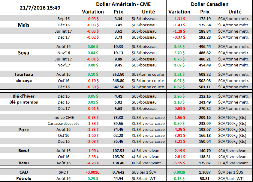 Le prix du cochon continu sa décente aux enfers avec une baisse de 1.425 cents sur octobre, une correction de 12 cents depuis la mi-juin. Techniquement les prix ont même chuté sous les bas du 11 novembre dernier à 61.775 avant de reprendre en après-midi et clôturer tout juste au-dessus à 62.45. Ce sera très important de voir le comportement du marché face à ce support absolu sur le contrat d’octobre 2016. Les baisses ont été plus marquées pour l’hiver, le printemps et l’été prochain avec un marché en fermeture de presque 3 cents. La météo clémente cette été amènera une abondance de grain a bon marché et les analystes s’adaptent à la possibilité de la poursuite de l’expansion du troupeau – faut-il encore que le prix du porc se maintienne car sinon les marges ne supportent plus cette théorie… Pour l’instant la demande est au rendez-vous car le prix de la découpe (88.91 cents) demeure élevé en comparaison du prix cash et les marges d’abattage empoche 28$ par porc – Une nette amélioration depuis un mois et un retour vers les valeurs de l’automne dernier.