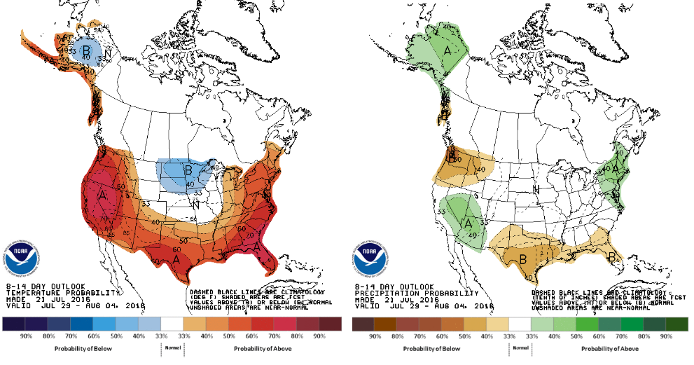 Prévision 8-14 jours : du 29 juillet au 4 aout. Température clémente sous les normales et précipitations normales.
