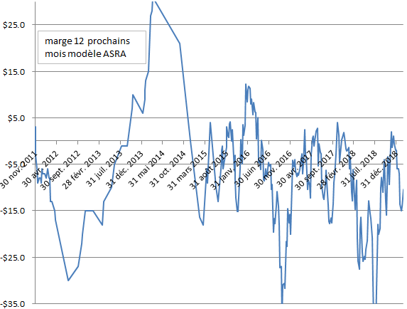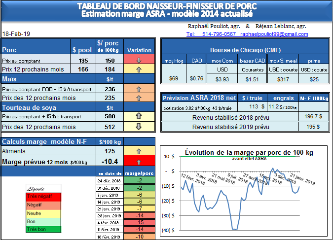 -Les revenus de porcs pour les 12 prochains mois seraient présentement de 184$ pour 100 kg carcasse ( 166$ de pool Qualité Québec ) , soit une marge de –10.40 $ par porc ; cette semaine les lean hog éloignés ont remonté, l’été 2019 est repassé de 77$ US à 80$ US; en fait les prix en canadien pour juillet- août 2019 sont loin d’être vilains à 215$ par porc, le problème c’est le court terme.... le prix au comptant baisse encore à 55 $ US ( découpe à 63$ , c’est très bas ), soit 150$ par porc comme prix du jour au Québec. Le contrat de février a fini bien faible, sur le court terme pour avril l’abondance de porc aux États-Unis pèse; mais pour plus tard rien n’est joué, si vous avez vu passer l’article de RaboBank supposant une perte de 20% du cheptel chinois à venir, mais ça reste des suppositions.
