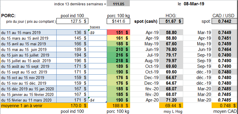 Le taux de change baisse dans les 0.74 , et les hogs remontent de 1 sous, proche de 80 $ US pour l'été 2019 ; cela peut sembler surprenant avec le prix au comptant si bas ( 140 $ par porc ), mais la Ferme Témoin est à 2$ près de prendre de nouvelles positions de bourse dans le porc, les prix remontent vite pour les périodes suivantes.... Même que le spread entre aujourd'hui et le 15 avril est assez élevé ( 51 $ US cash, 59$ US sur avril, soit 20$ par porc ).