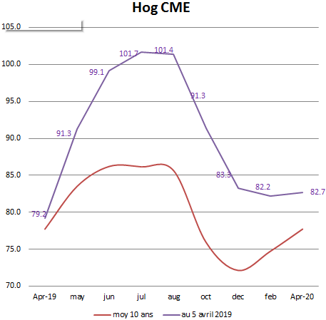 Les porcs de juillet et août rapporteraient 275$ du 100 kg, le comptant est déjà rendu à 213$ par porc de 100 kg, mais monte moins vite depuis quelques jours; déjà le 15 mai les porcs rapporteraient 249 $. Les contrats d’été 2019 sont de retour à leur sommet atteint à la fin mars, la marge est pas mal plus haute, car les autres contrats ont aussi décollé ( mai 2019 , octobre... ) . Le marché ‘’sur-prime’’ les contrats d’été 2019 versus leurs historique respective aux autres échéances , à partir maintenant du mois de mai 2019, versus des positions plus lointaines, comme avril 2020... est-ce que les chinois vont importer du porc si rapidement pour mai 2019, et auront beaucoup ralenti pour avril 2020 ?