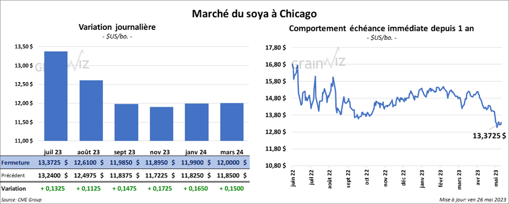 Les contrats de soya US aux échéances les plus rapprochées ont clôturé avec des gains entre 11 ¼ et 14 ¾ cents. Ceux de tourteau de soya US aux échéances les plus rapprochées ont également fini dans le vert entre 4,10 et 5,00 $/tonne. Les contrats d’huile de soya US aux échéances les plus rapprochées ont fermé en progression entre 30 et 36 points.