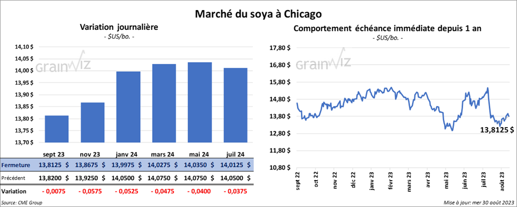 Le contrat de soya US sept. 23 a clôturé à 13,8125 $ (- ¾ cent). Celui nov. 23 a fermé à 13,8675 $ (- 5 ¾ cents). Celui janv. 24 a terminé à 13,9975 $ (- 5 ¼ cents). Quant au tourteau de soya US, le contrat sept. 23 a fini à 423,00 $/tonne (+ 3,70 $/tonne). Celui oct. 23 a clôturé à 411,00 $/tonne (- 1,60 $/tonne). Celui déc. 23 a fermé à 410,20 $/tonne (- 1,70 $/tonne). Du côté de l’huile de soya US, le contrat sept. 23 a terminé à 4,6175 $ (- 7 points). Celui déc. 23 a fini à 4,8075 $ (- 6 points).