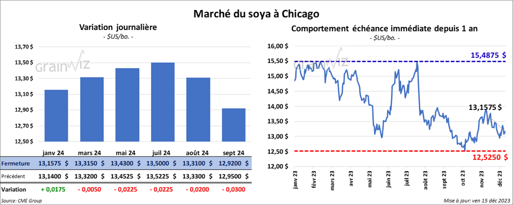 Le contrat de soya US, janv. 24 a clôturé à 13,1575 $ (+ 1 ¾ cent). Celui mars 24 a fermé à 13,3150 $ (- ½ cent). Celui mai 24 a terminé à 13,4300 $ (- 2 ¼ cents). Quant au tourteau de soya US, le contrat janv. 24 a fini à 405,60 $/tonne (+ 1,90 $/tonne). Celui mars 24 a clôturé à 396,60 $/tonne (+ 80 cents/tonne). Celui mai 24 a fermé à 393,00 $/tonne (- 1,20 $/tonne). Du côté de l’huile de soya US, le contrat janv. 24 a terminé à 49,99 $ (+ 48 points). Celui mars 24 a fini à 50,15 $ (+ 44 points).