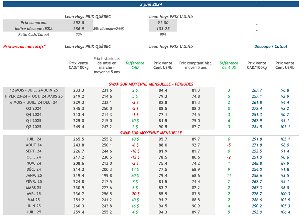 • La semaine dernière, les contrats à terme sur le porc pour la prochaine année étaient relativement stable. Le mois de juin-24 a légèrement augmenté 0,075 cents US/livre tandis que juillet-24 était légèrement à la baisse de 0,1 cents US/livre.