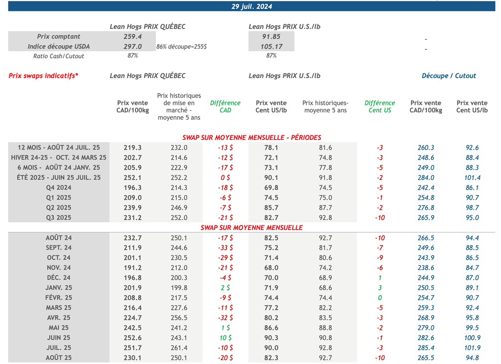 • Du côté du marché du gros, l'indice de la découpe de porc américain a gagné 3,01 cents US/livre au cours de la semaine pour s’établir à 105,17 cents US/lb vendredi. Pendant ce temps, l'indice du porc au comptant du CME était aussi en hausse, gagnant 2,12 cents US/lb sur la semaine pour s'établir à 91,39 cents US/lb vendredi.