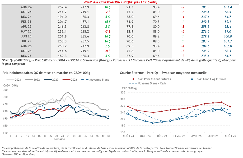 • Les contrats à terme sur le porc étaient en hausse la semaine dernière, menés une fois de plus par les échéances d’hiver. Notamment, le contrat de décembre-24 a gagné 3,400 cents US/lb sur la semaine pour terminer à 70,33 cents US/lb vendredi.