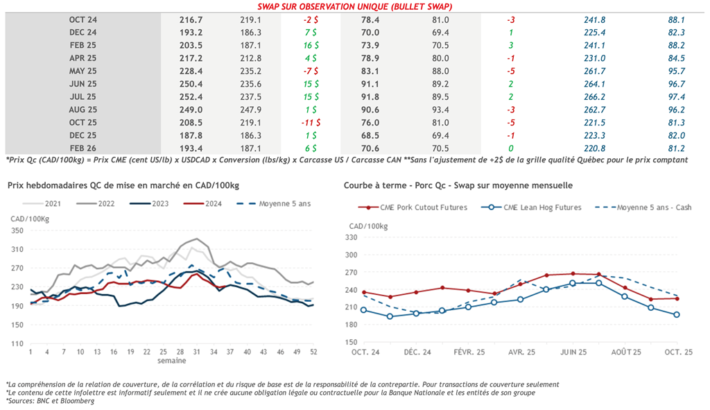 • Les contrats à terme sur le porc ont terminé en ordre dispersé la semaine dernière, les échéances rapprochées terminant en territoire négatif alors que les contrats à plus long-terme finissaient avec de légères hausses. Notamment, le contrat d’octobre-24 a perdu 2,72 cents US/lb sur la semaine pour terminer à 79,50 cents US/lb vendredi.