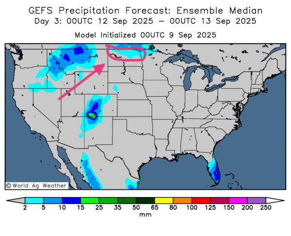 - Globalement, le contexte météo US à court terme reste favorable ; les cartes GFS américaines (World Ag Weather), illustrées jusqu’au 3e jour, montrent surtout un temps sec à l’échelle du Midwest et des Grandes Plaines, avec un risque de pluies pour le nord-ouest du Midwest (vers le Dakota du Nord). C'est ce que montre notamment la carte du 3e jour ci-contre.