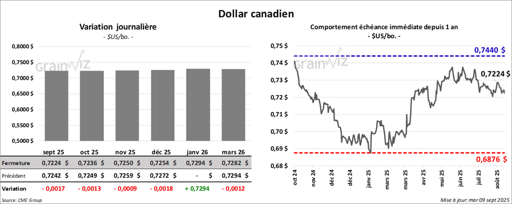 À Kansas, le contrat septembre 25 a fini à 4,9225 $ (+ 10 ½ cents). Celui décembre 25 a clôturé à 5,1725 $ (+ 12 cents). Celui mars 26 a fermé à 5,3775 $ (+ 12 cents).