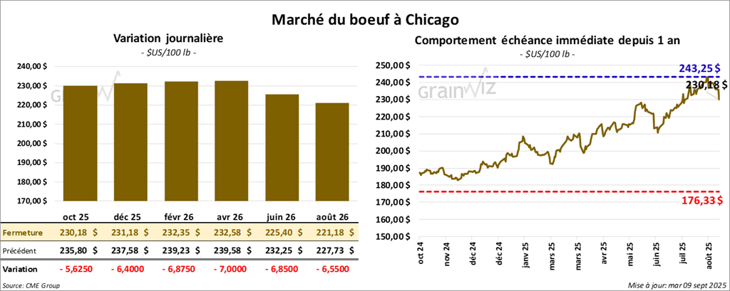 Le contrat de bœuf américain octobre 25 a clôturé à 230,18 $ (-5,63 $). Celui décembre 25 a fermé à 231,18 $ (-6,40 $). Celui février 26 a terminé à 232,35 $ (-6,88 $).