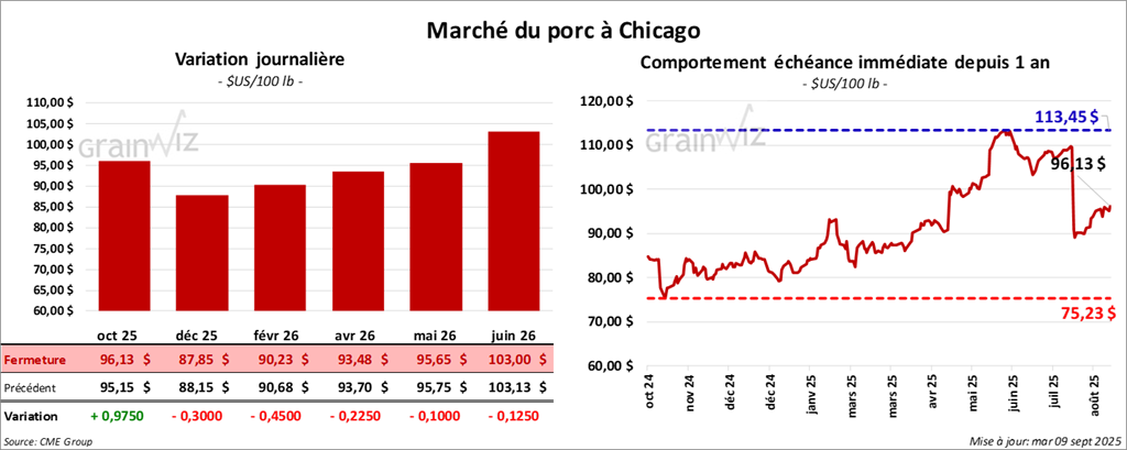 Le contrat de porc américain octobre 25 a clôturé à 96,13 $ (+ 97 cents). Celui décembre 25 a fermé à 87,85 $ (-30 cents). Celui février 26 a terminé à 90,22 $ (-45 cents).
