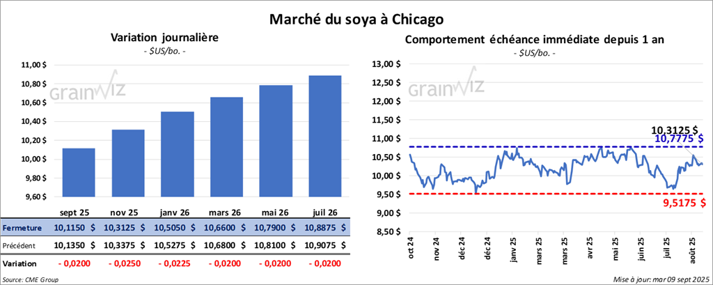 Le contrat de soya américain septembre 25 a clôturé à 10,1150 $ (-2 cents). Celui novembre 25 a fermé à 10,3125 $ (-2 ½ cents). Celui janvier 26 a terminé à 10,5050 $ (-2 ¼ cents).