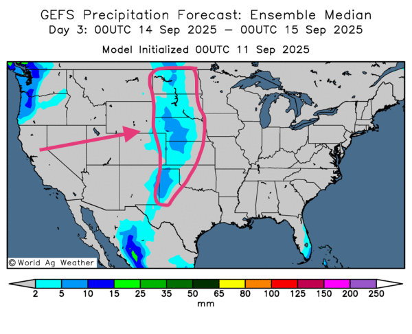 - Cartes GFS/World Ag Weather (jusqu’au 3e jour) : principalement sec à l’est du Midwest ; ailleurs (nord-ouest du Midwest et autres régions des Plaines), pluies faibles la plupart du temps ; la carte du 3e jour confirme.