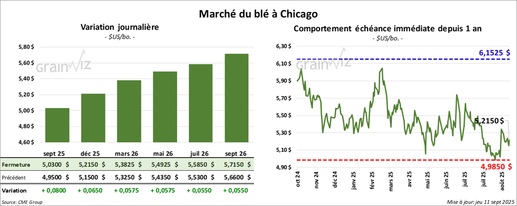 À Chicago, le contrat septembre 25 a clôturé à 5,0300 $ (+ 8 cents). Celui décembre 25 a fermé à 5,2150 $ (+ 6 ½ cents). Celui mars 26 a terminé à 5,3825 $ (+ 5 ¾ cents).
