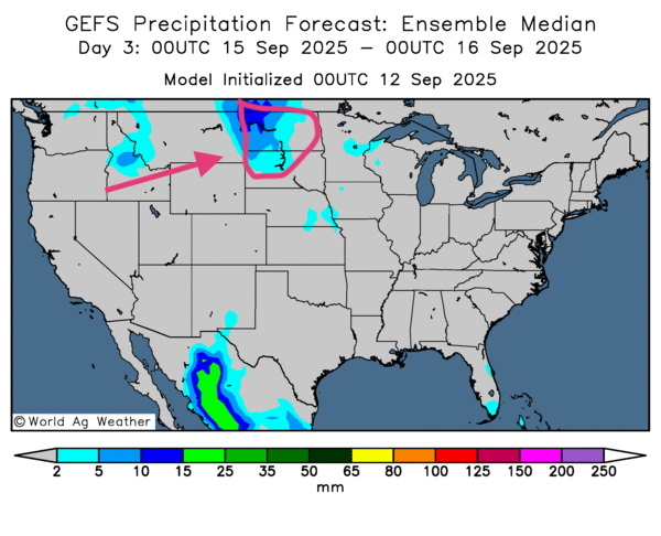 - À court terme, les cartes GFS (World Ag Weather; horizon jusqu’au 3e jour) suggèrent des pluies possibles sur les Plaines américaines — surtout au nord, près du Dakota du Nord —; ailleurs dans le Midwest, le temps resterait souvent sec (voir carte du 3e jour).
