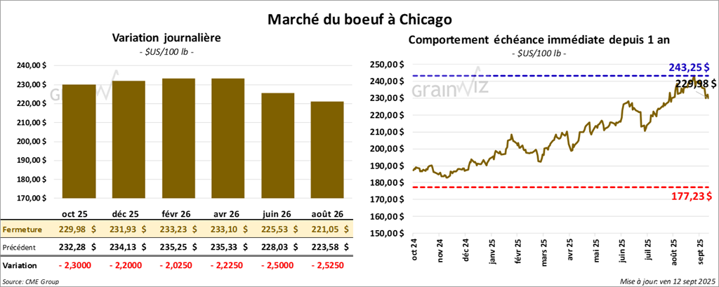 Le contrat de bœuf américain octobre 25 a clôturé à 229,97 $ (- 2,30 $). Celui décembre 25 a fermé à 231,93 $ (-2,20 $). Celui avril 26 a terminé à 233,10 $ (-2,23 $).