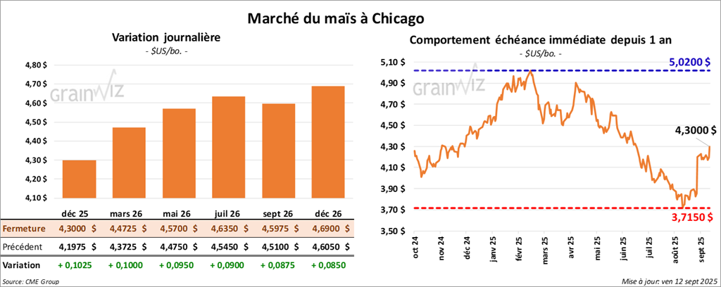 Le contrat de maïs américain décembre 25 a clôturé à 4,3000 $ (+ 10 ¼ cents). Celui mars 26 a fermé à 4,4725 $ (+ 10 cents). Celui mai 26 a terminé à 4,5700 $ (+ 9 ½ cents).