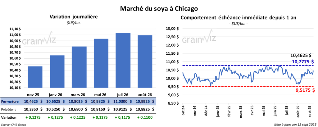 Le contrat de soya américain novembre 25 a clôturé à 10,4625 $ (+ 12 ¾ cents). Celui janvier 26 a fermé à 10,6525 $ (+ 12 ¾ cents). Celui mars 26 a terminé à 10,8025 $ (+ 12 ¼ cents).