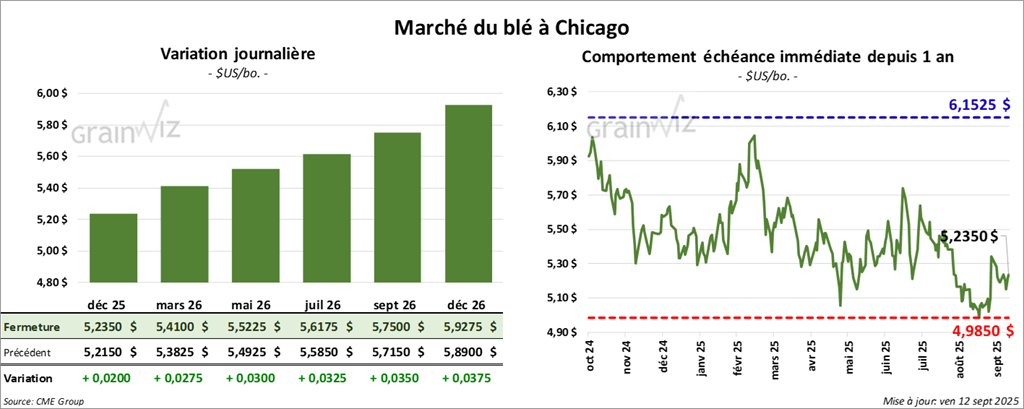 À Chicago, le contrat de blé décembre 25 a clôturé à 5,2350 $ (+ 2 cents). Celui mars 26 a fermé à 5, 4100 $ (+ 2 ¾ cents). Celui mai 26 a terminé à 5,5225 $ (+ 3 cents).