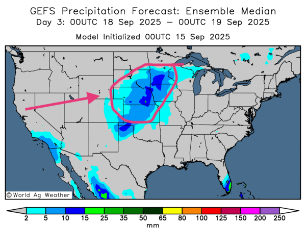 - Globalement, les perspectives restent favorables à court terme. Mais les cartes GFS (World Ag Weather), illustrées jusqu’au 3e jour, montrent très peu de précipitations pour l’est du Midwest; l’essentiel des pluies devrait tomber au centre du pays (Plaines centrales) et un peu plus à l’est: Minnesota, Wisconsin, Iowa (voir la carte ci-contre).