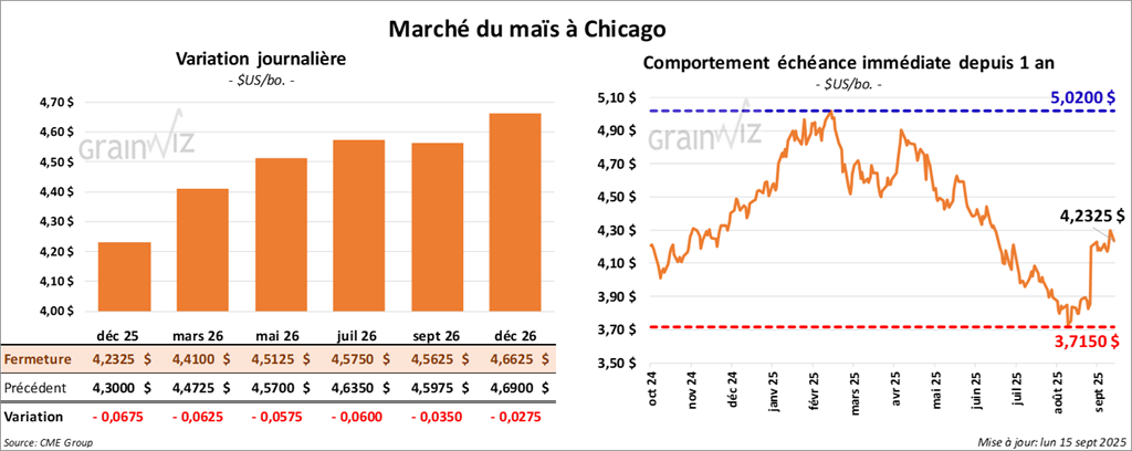 Le contrat de maïs américain décembre 25 a clôturé à 4,2325 $ (- 6 ¾ cents). Celui mars 26 a fermé à 4,4100 $ (- 6 ¼ cents). Celui mai 26 a terminé à 4,5125 (- 5 ¾ cents).