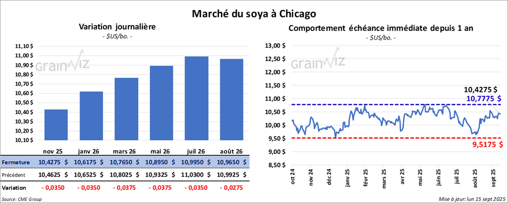 Le contrat de soya américain novembre 25 a clôturé à 10,4275 $ (- 3 ½ cents). Celui janvier 26 a fermé à 10,6275 $ (- 3 ½ cents). Celui mars 26 a terminé à 10,7650 $ (- 3 ¾ cents).