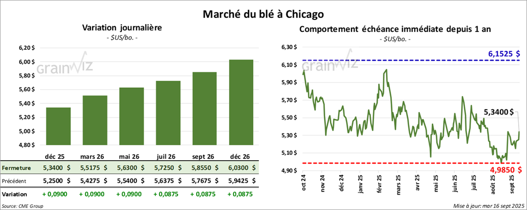 À Chicago, le contrat de blé décembre 25 a clôturé à 5,3400 $ (+ 9 cents). Celui mars 26 a fermé à 5,5175 $ (+ 9 cents). Celui mai 26 a terminé à 5,6300 $ (+ 9 cents).