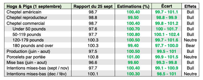 Les résultats publiés aujourd'hui devraient avoir un effet positif sur les prix et ce mur à mur! Je ne vois rien de négatif dans ce rapport. Moins de porcs partout dans toutes les catégories, dans toutes les strates de poids, dans le cheptel reproducteur. Bref, un rapport très positif. Par contre, l’organisme a tout de même révisé à la hausse les données des mois précédents (1,9% par exemple pour les inventaires de porc au 1 juin) donnant une impression de baisse trop marqué sur les chiffres publiés aujourd’hui.