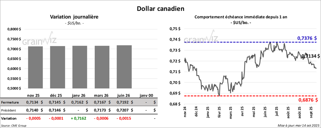 À Chicago, le contrat de blé décembre 25 a clôturé à 5,0025 $ (+ 3 ½ cents). Celui mars 26 a fermé à 5,1675 $ (+ 3 ½ cents). Celui mai 26 a terminé à 5,2825 $ (+ 3 cents).