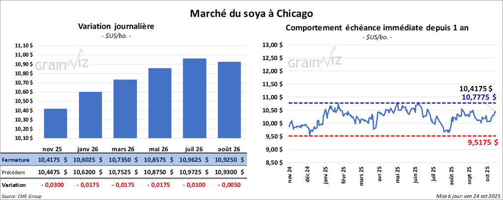 Le contrat de soya américain novembre 25 a clôturé à 10,4175 $ (-3 cents). Celui janvier 26 a fermé à 10,6025 $ (- 1 ¾ cent). Celui mars 26 a terminé à 10,7350 $ (- 1 ¾ cent).