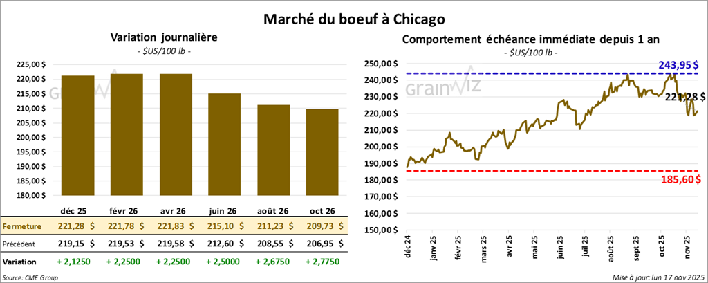 Le contrat de bœuf américain décembre 25 a clôturé à 221,28 $ (+ 2,13 $). Celui février 26 a fermé à 221,78 $ (+ 2,25 $). Celui avril 26 a terminé à 221,83 $ (+ 2,25 $).