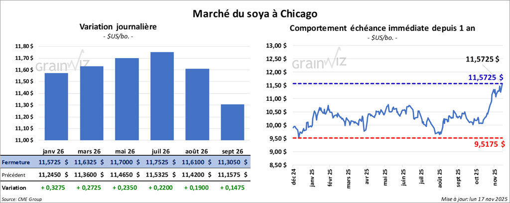 Le contrat de soya américain janvier 26 a clôturé à 11,5725 $ (+ 32 ¾ cents). Celui mars 26 a fermé à 11,6325 $ (+ 27 ¼ cents). Celui mai 26 a terminé à 11,7000 $ (+ 23 ½ cents).