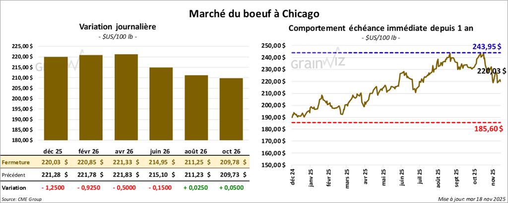Le contrat de bœuf américain décembre 25 a clôturé à 220,03 $ (-1,25 $). Celui février 26 a fermé à 220,85 $ (-93 cents). Celui avril 26 a terminé à 221,33 $ (-50 cents).