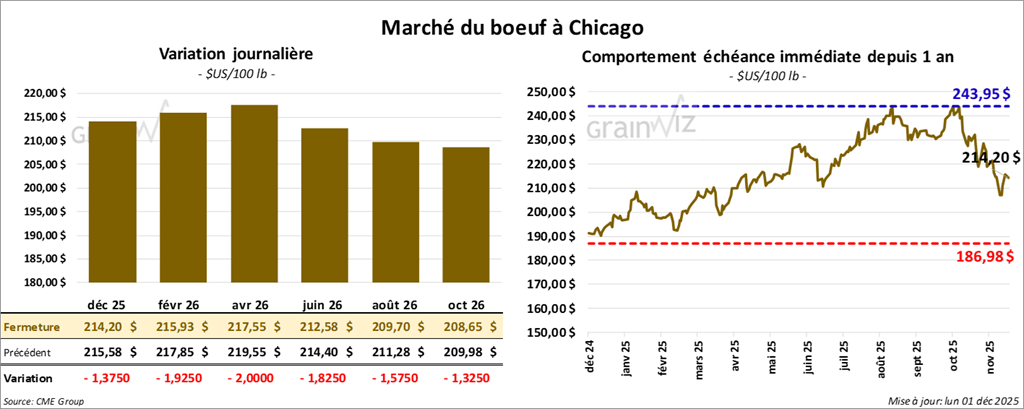 Le contrat de bœuf américain décembre 25 a clôturé à 214,20 $ (-1,38 $). Celui février 26 a fermé à 215,93 $ (-1,93 $). Celui avril 26 a terminé à 217,55 $ (-2,00 $).