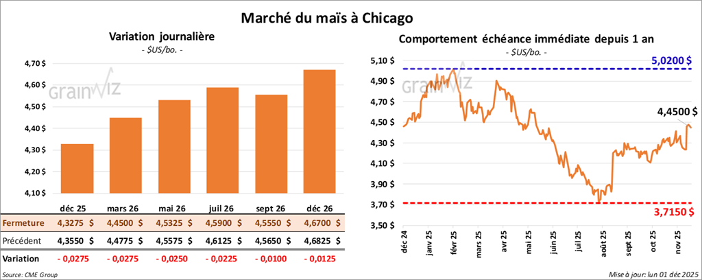 Le contrat de maïs américain décembre 25 a clôturé à 4,3275 $ (- 2 ¾ cents). Celui mars 26 a fermé à 4,4500 $ (- 2 ¾ cents). Celui mai 26 a terminé à 4,5325 $ (-2 ½ cents).