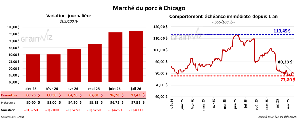 Le contrat de porc américain décembre 25 a clôturé à 80,23 $ (-38 cents). Celui février 26 a fermé à 80,30 $ (-70 cents). Celui avril 26 a terminé à 84,28 $ (-63 cents).