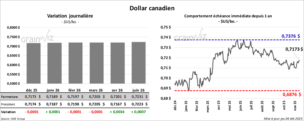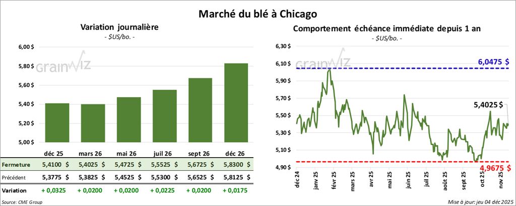 À Chicago, le contrat de blé décembre 25 a clôturé à 5,4100 $ (+ 3 ¼ cents). Celui mars 26 a fermé à 5,4025 $ (+ 2 cents). Celui mai 26 a terminé à 5,4725 $ (+ 2 cents).