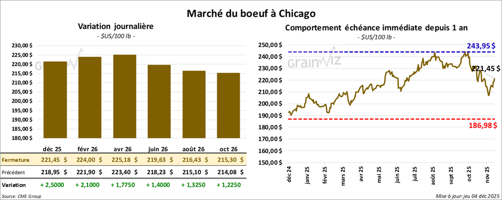 Le contrat de bœuf américain décembre 25 a clôturé à 221,45 $ (+ 2,50 $). Celui février 26 a fermé à 224,00 $ (+ 2,10). Celui avril 26 a terminé à 225,18 $ (+ 1,78 $).