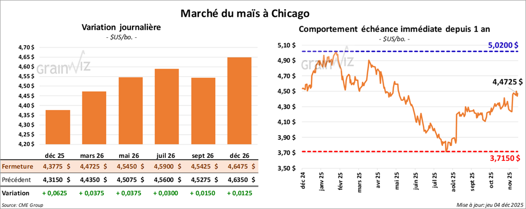 Le contrat de maïs américain décembre 25 a clôturé à 4,3800 $ (+ 6 ½ cents). Celui mars 26 a fermé à 4,4750 $ (+ 4 cents). Celui mai 26 a terminé à 4, 5450 $ (+ 3 ¾ cents).