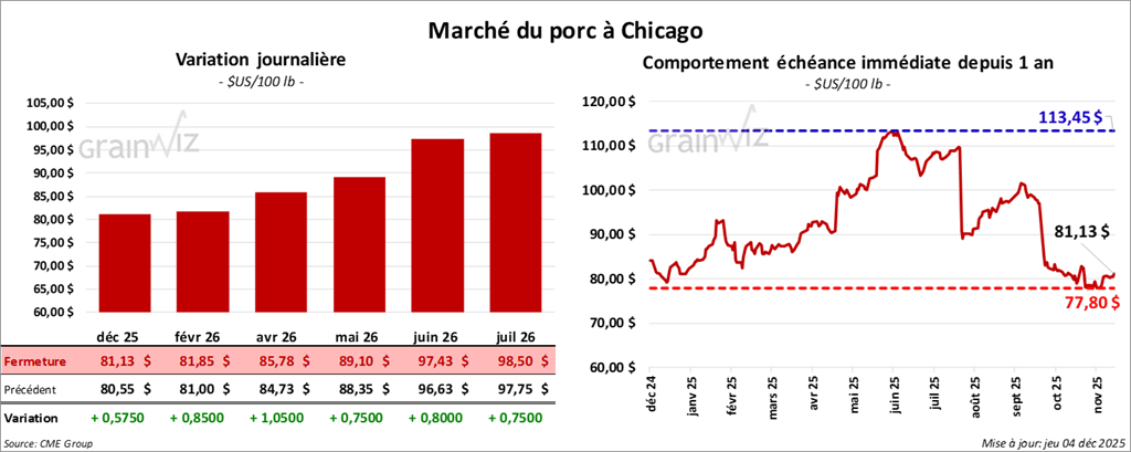 Le contrat de porc américain décembre 25 a clôturé à 81,13 $ (+ 58 cents). Celui février 26 a fermé à 81,85 $ (+ 85 cents). Celui avril 26 a terminé à 85,78 $ (+ 1,05 $).