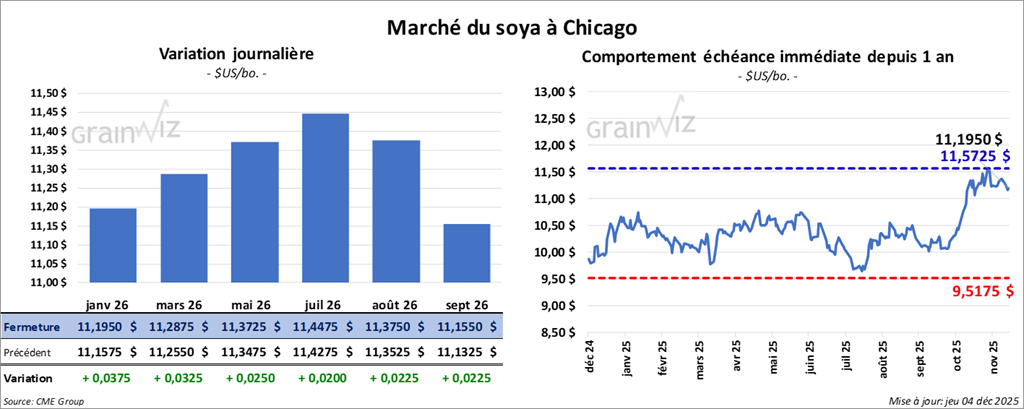 Du côté de l'huile de soya américaine, le contrat décembre 25 a terminé à 51,53 $ (+ 18 points). Celui janvier 26 a fini à 51,79 $ (+ 12 points).