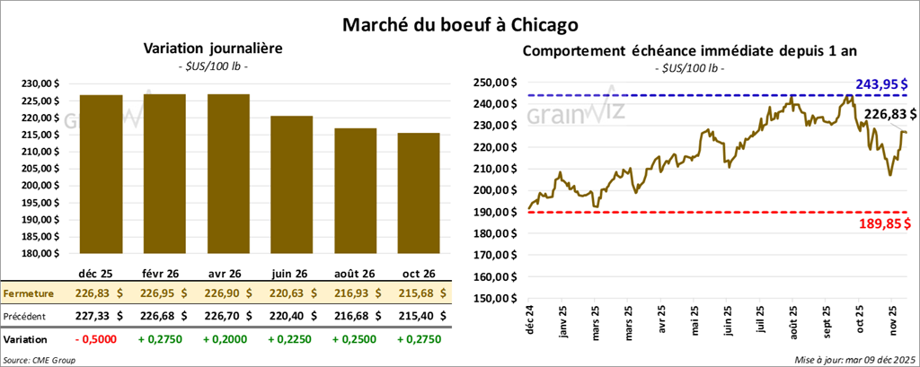 Le contrat de bœuf américain décembre 25 a clôturé à 226,83 $ (-50 cents). Celui février 26 a fermé à 226,95 $ (+ 28 cents). Celui avril 26 a terminé à 226,90 $ (+ 20 cents).