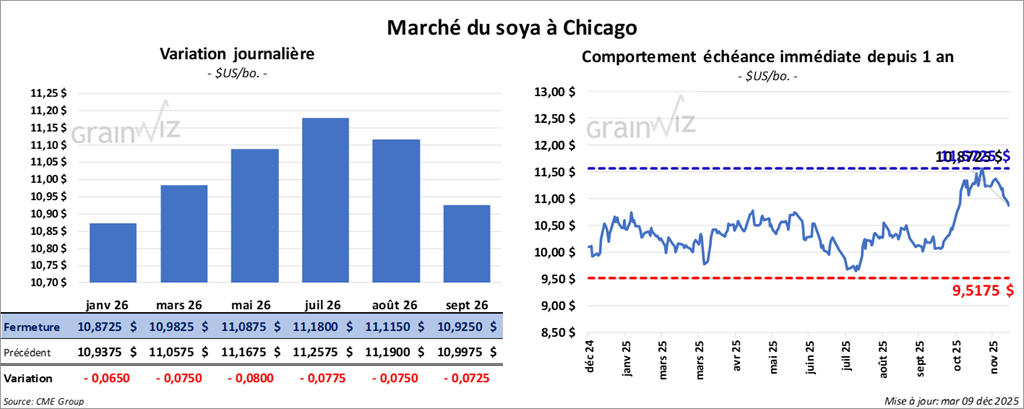 Le contrat de soya américain janvier 26 a clôturé à 10,8725 $ (+ 6 ½ cents). Celui mars 26 a fermé à 10,9825 $ (- 7 ½ cents). Celui mai 26 a terminé à 11,0875 $ (- 8 cents).