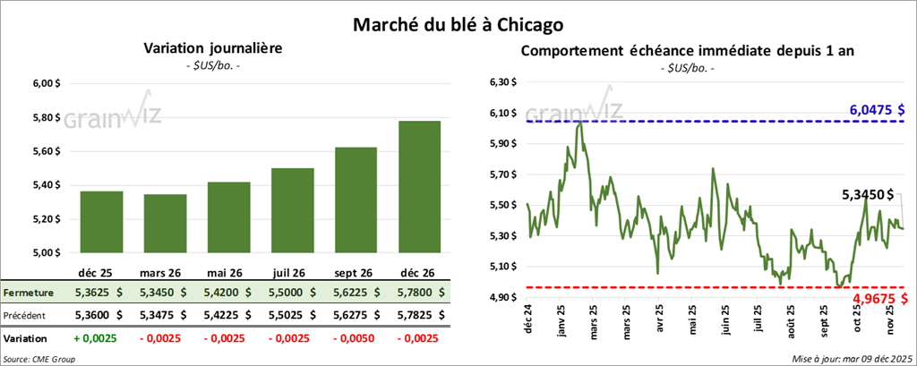 À Chicago, le contrat de blé décembre 25 a clôturé à 5,3625 $ (+ ¼ cent). Celui mars 26 a fermé à 5,3450 $ (- ¼ cent). Celui mai 26 a terminé à 5,4200 $ (- ¼ cent).