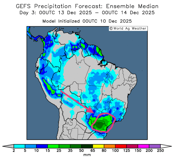 - LSEG mentionne que les prévisions de pluies très abondantes pour le centre du Brésil au cours des 2 prochaines semaines pourraient affecter le développement du maïs et du soya qui s’y trouvent.