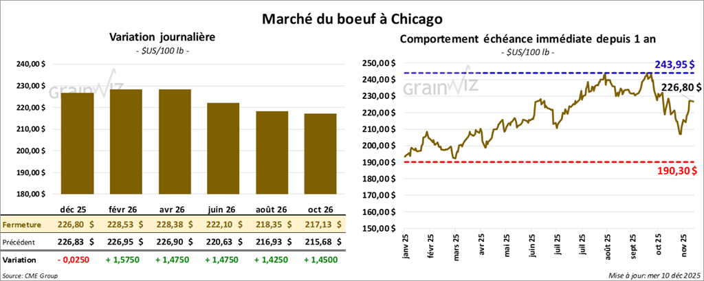 Le contrat de bœuf américain décembre 25 a clôturé à 226,80 $ (-3 cents). Celui février 26 a fermé à 228,53 $ (+ 1,58 $). Celui avril 26 a terminé à 228,38 $ (+ 1,48 $).