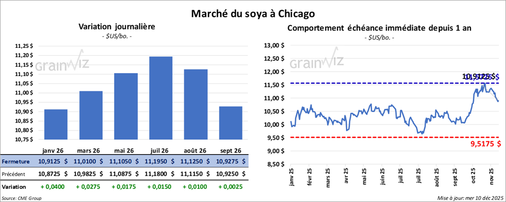 Le contrat de soya américain janvier 26 a clôturé à 10,9125 $ (+ 4 cents). Celui mars 26 a fermé à 11,0100 $ (+ 2 ¾ cents). Celui mai 26 a terminé à 11,1050 $ (+ 1 ¾ cent).