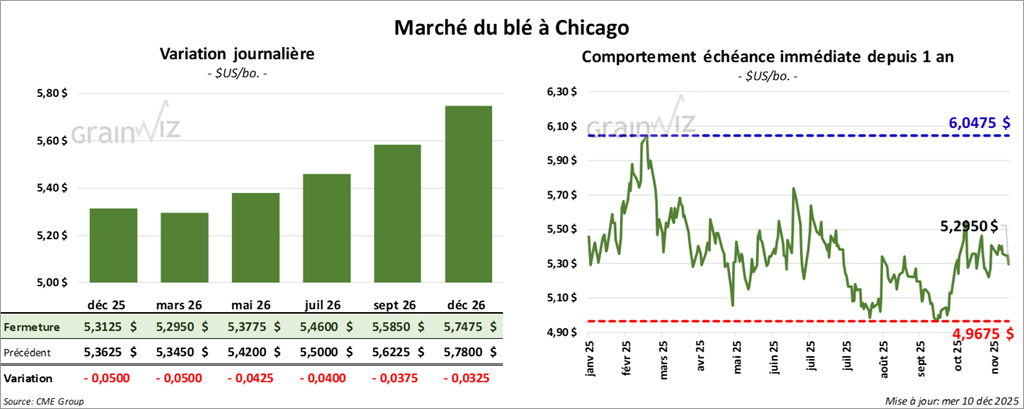 À Chicago, le contrat de blé décembre 25 a clôturé à 5,3125 $ (- 5 cents). Celui mars 26 a fermé à 5,2950 $ (- 5 cents). Celui mai 26 a terminé à 5,3775 $ (- 4 ¼ cents).