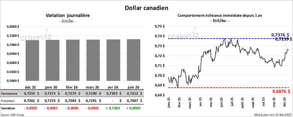 À Chicago, le contrat de blé mars 26 a clôturé à 5,2075 $ (-8 ½ cents). Celui mai 26 a fermé à 5,2900 $ (- 8 ¼ cents). Celui juillet 26 a terminé à 5,3825 $ (- 7 ½ cents).